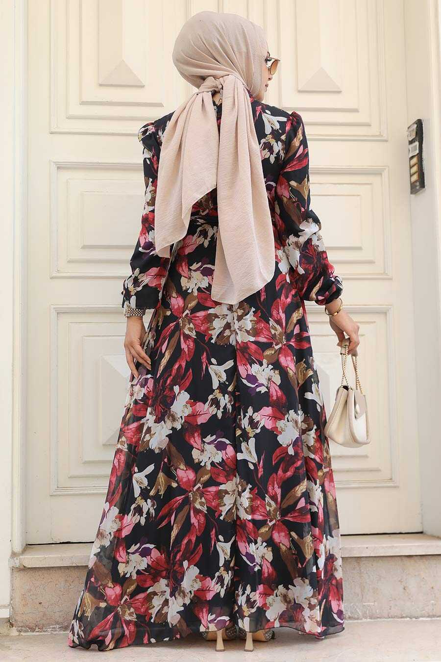 Red Floral Chiffon Modest Dress
